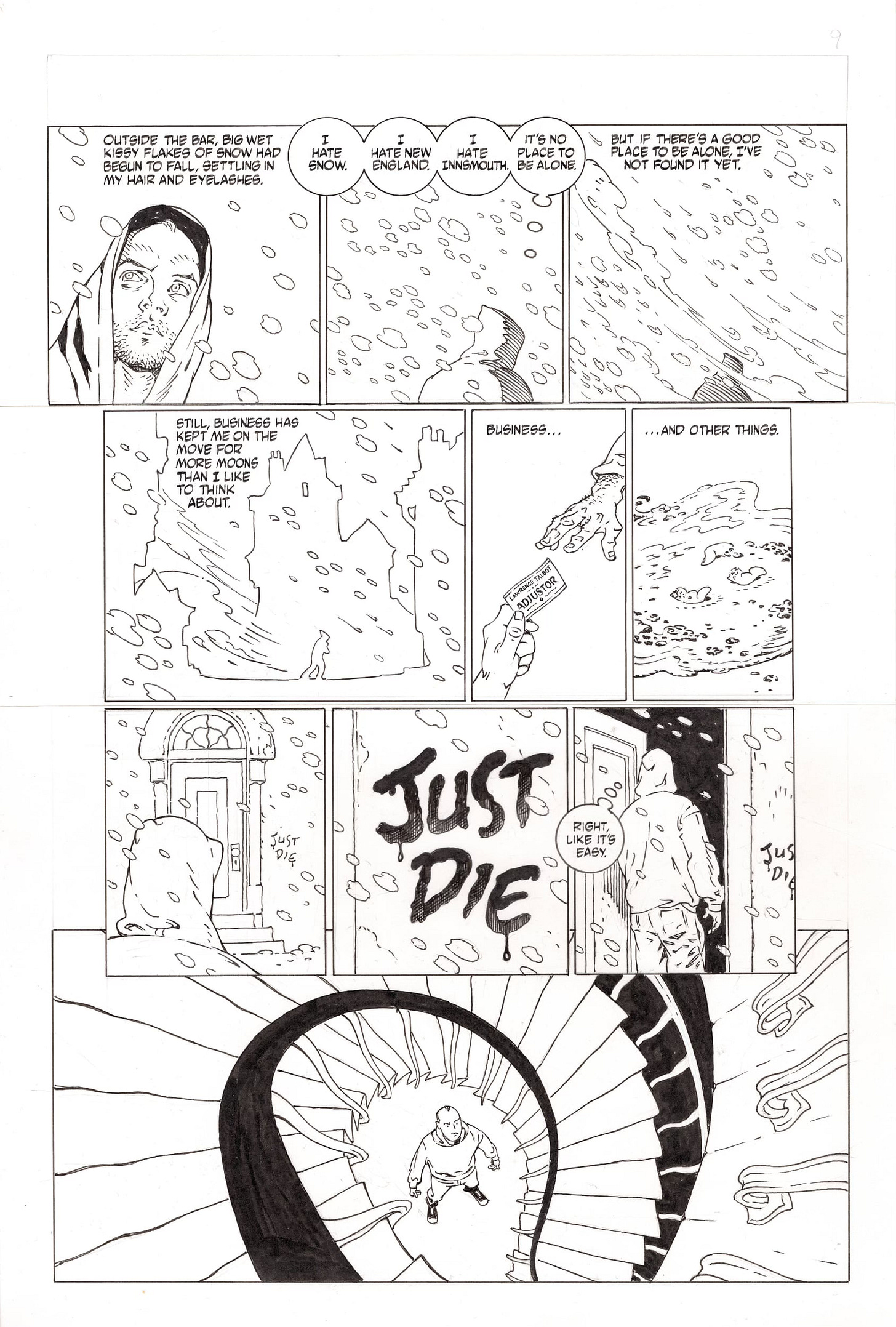 P. CRAIG RUSSELL: Only the End of the World Again. Page 9. I did some 1,500 pages of layouts between the first publication of this story and my final finishes, and that gives some time to reflect. So, panels 5 and 6 differ from the original. Instead of just continuing his walk into the building I used those panels in a different way. One was to show who (or wha)t he as an “adjuster” was handing his card to (a suspiciously hairy hand.) The other was to show exactly what “and other things” referred to . . . the previously seen vomited little fingers.