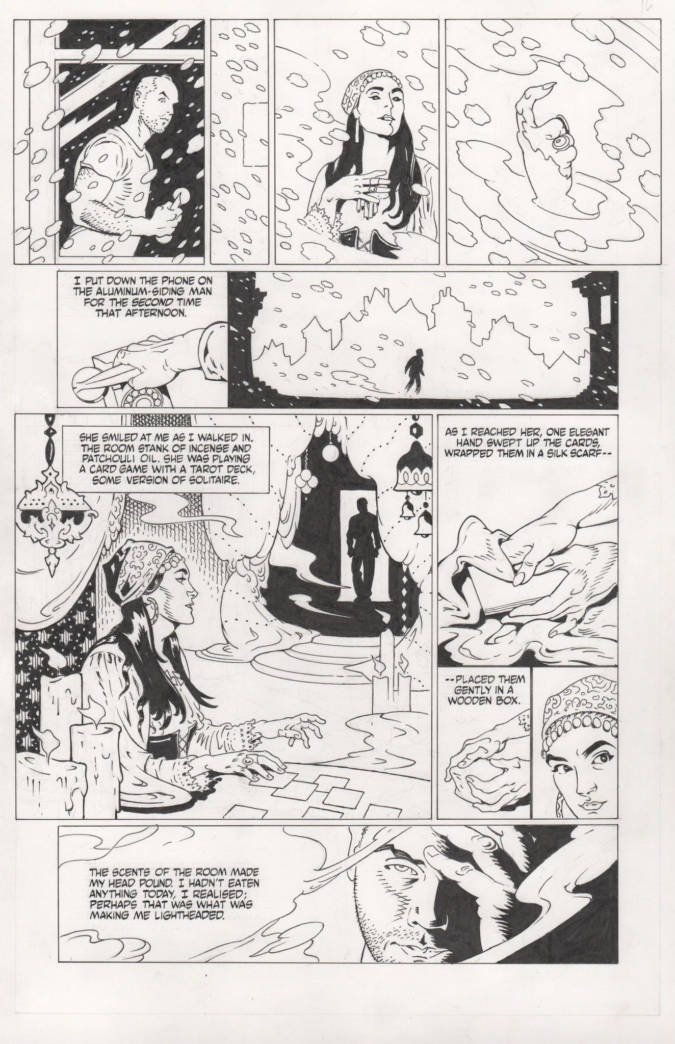 The Room Stank of Incense and Patchouli OilPage 16 from P. Craig Russell's unpublished second adaptation of Neil Gaiman's 'Only the End of the World Again.'Wayne Alan HaroldJan 28, 20266ShareP. CRAIG RUSSELL: Again with the color design. Colors holds in panels 2-4 as her beckoning hand floats out of the blizzard.ShareShare The Art of P. Craig RussellMore from Wayne Alan Harold ProductionsPreviousNext